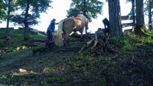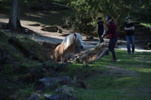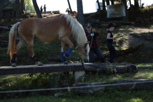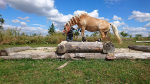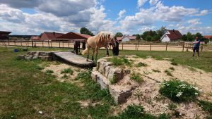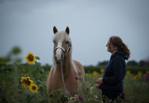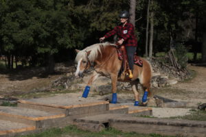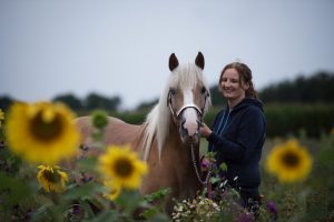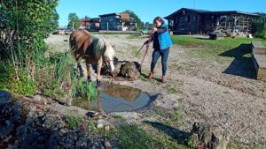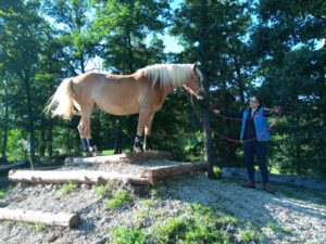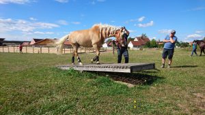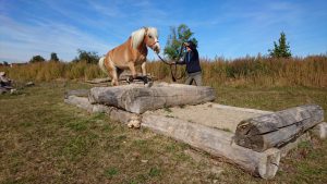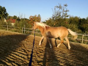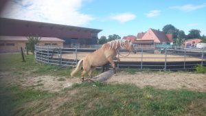 Das wieder antrainieren gestaltete sich mehr als schwierig, sie war schon vor dem Schaden unbalanciert und rannte eigentlich unter dem Reiter weg und war sehr schreckhaft. Es gab auch Rufe, ich solle sie verkaufen, sie wird nie zuverlässig. Mittlerweile hatte ich mich gut eingearbeitet in die blau-gelbe Welt und mir wurde klar, je weniger Balance mein Pferd hat, desto schreckhafter ist sie. Denn kaum etwas ist schlimmer für das Fluchttier Pferd als die Balance zu verlieren. In dieser Zeit haben wir auch viel Vertrauensarbeit gemacht und ich wusste, ich will diesen Weg weitergehen. Ich wollte selbst viel mehr lernen, habe u.a. den Basispass gemacht, den Sachkundenachweis, das Longierabzeichen und schließlich die Trainerausbildung Equikinetic und Dualaktivierung bei Michael Geitner.